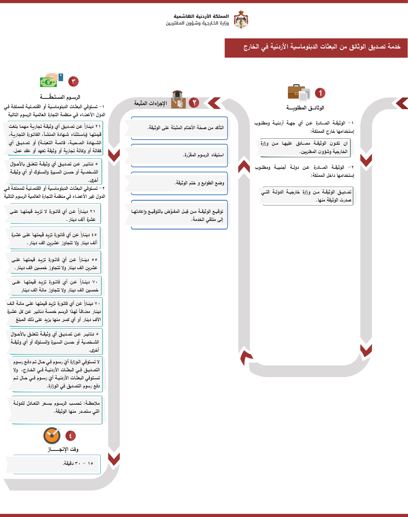 ملاحظة: تحسب الرسوم في البعثات الدبلوماسية الاردنية بسعر التعادل للدولة التي تصدر منها الوثيقة.