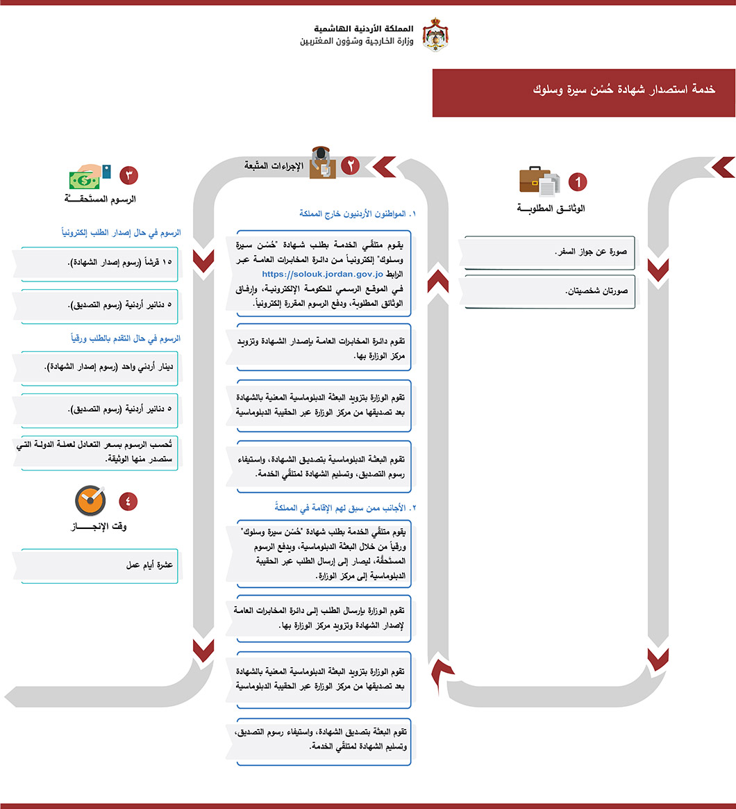 ملاحظة: تحسب الرسوم في البعثات الدبلوماسية الاردنية بسعر التعادل للدولة التي ستصدر منها الوثيقة.