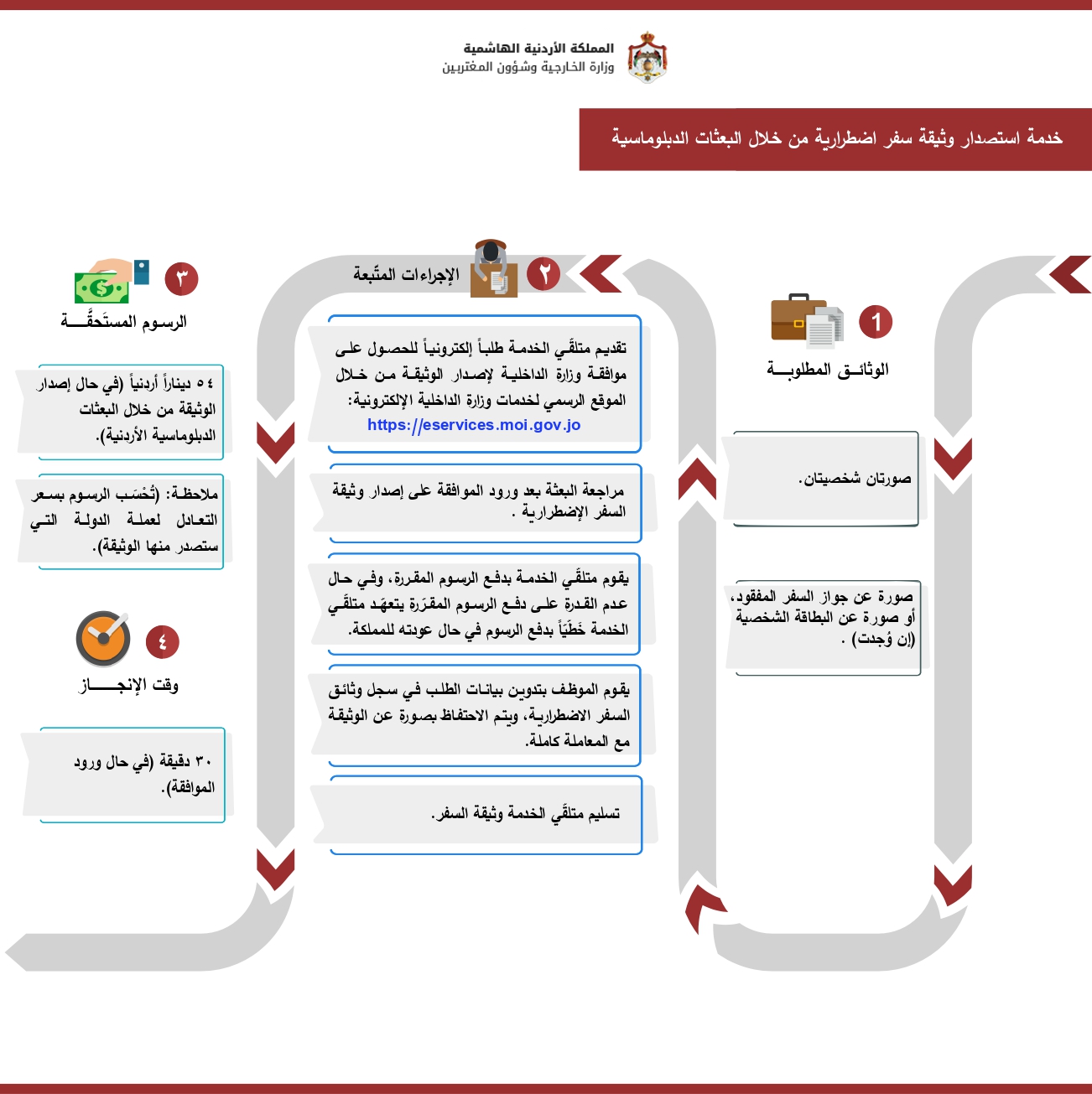 إنفاذاً لتوجيهات صاحب الجلالة الهاشمية الملك عبد الله الثاني ابن الحسين المعظم بخصوص رعاية وحماية وخدمة المغتربين الأردنيين، في كافة دول العالم، تحرص وزارة الخارجية وشؤون المغتربين وكافة إدارتها وبعثاتها الدبلوماسية على تحقيق تلك التوجيهات وبلورتها من خلال رعاية وحماية حقوق الأردنيين وخدمتهم أينما وجدوا، بما يتماشى مع القوانين والإتفاقيات الدولية...