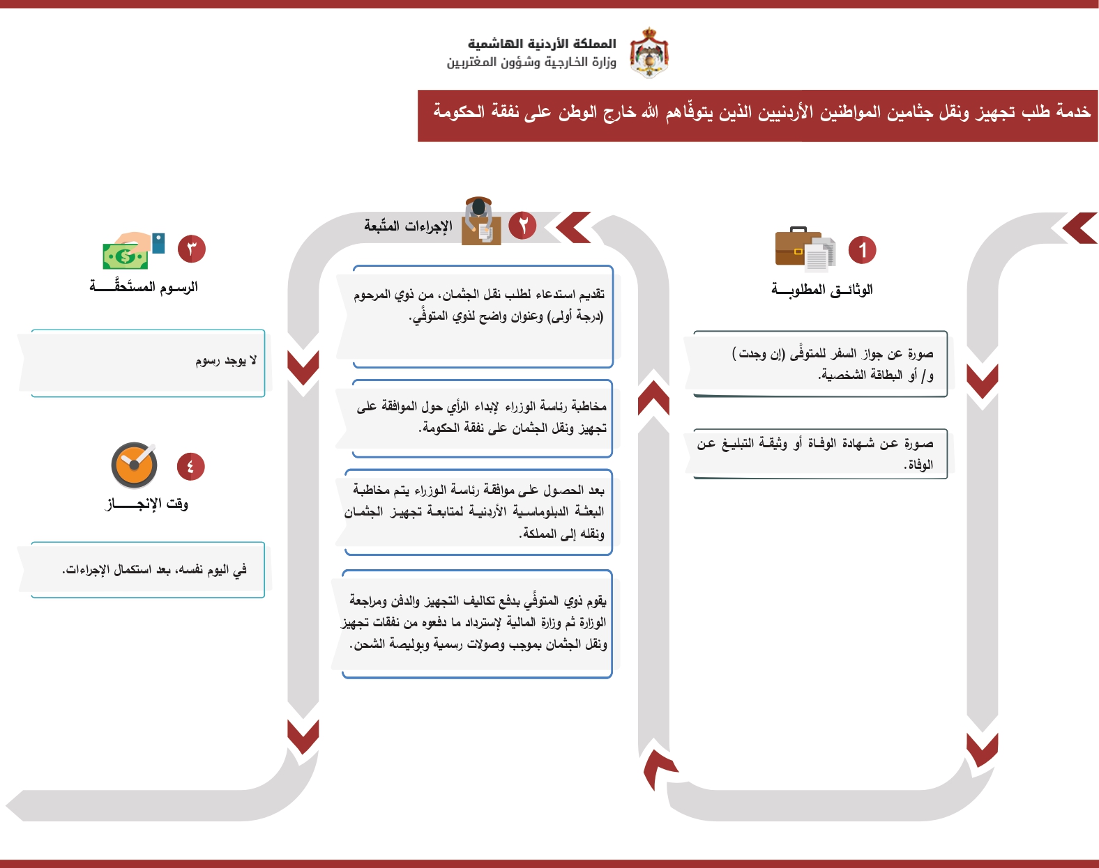 إنفاذاً لتوجيهات صاحب الجلالة الهاشمية الملك عبد الله الثاني ابن الحسين المعظم بخصوص رعاية وحماية وخدمة المغتربين الأردنيين، في كافة دول العالم، تحرص وزارة الخارجية وشؤون المغتربين وكافة إدارتها وبعثاتها الدبلوماسية على تحقيق تلك التوجيهات وبلورتها من خلال رعاية وحماية حقوق الأردنيين وخدمتهم أينما وجدوا، بما يتماشى مع القوانين والإتفاقيات الدولية...